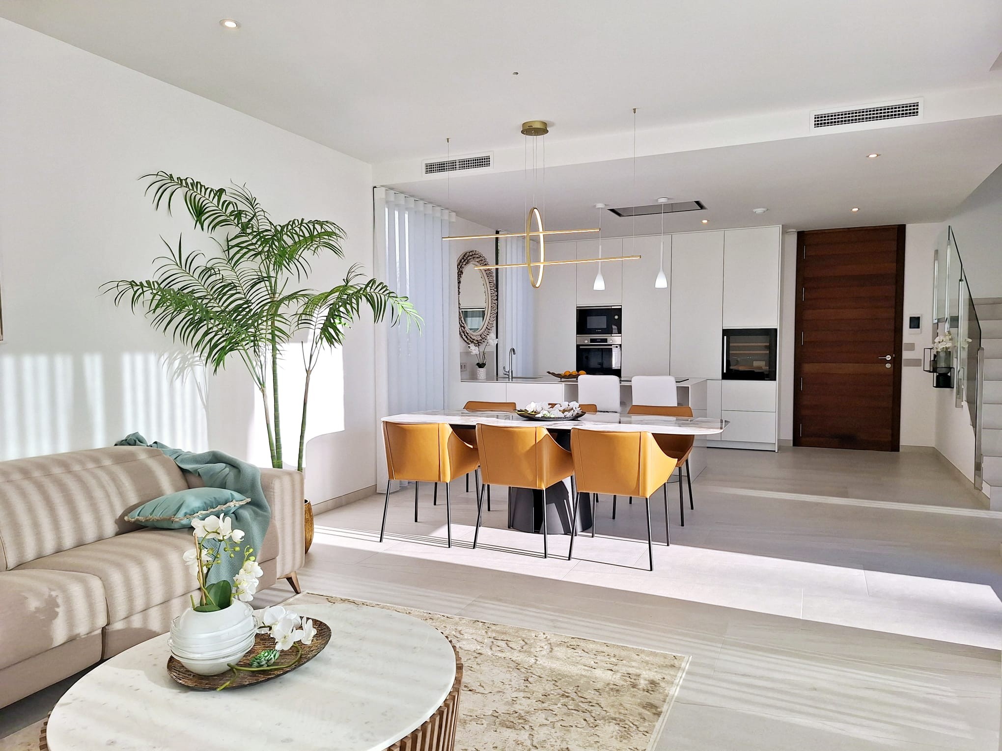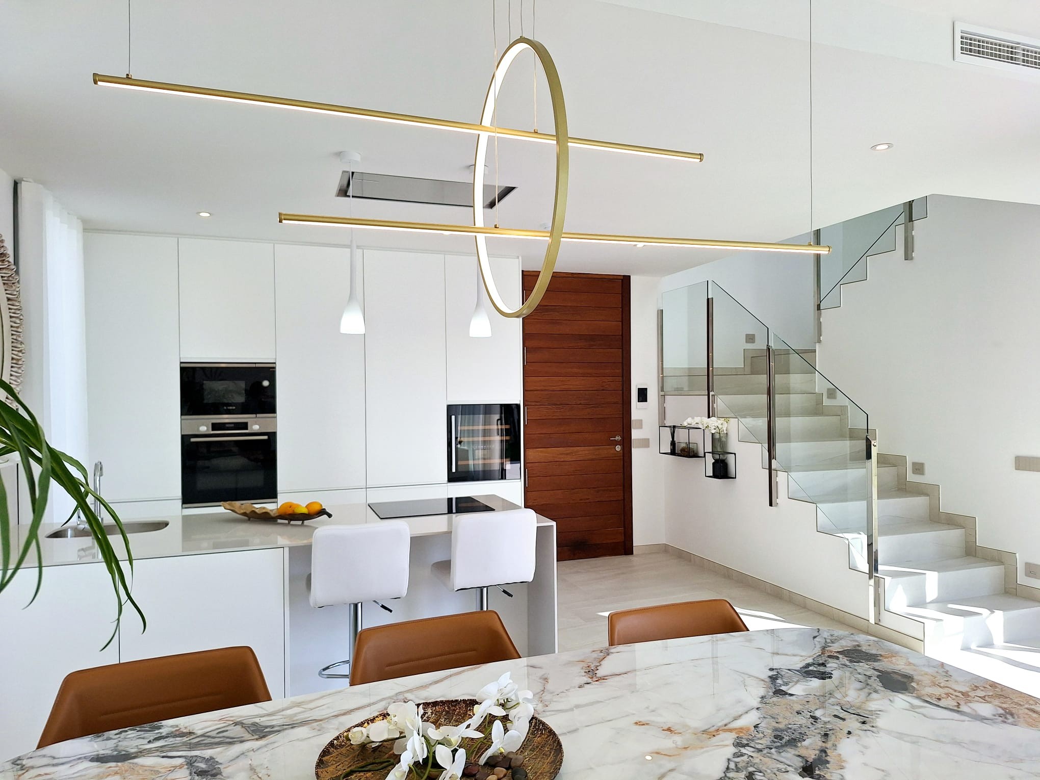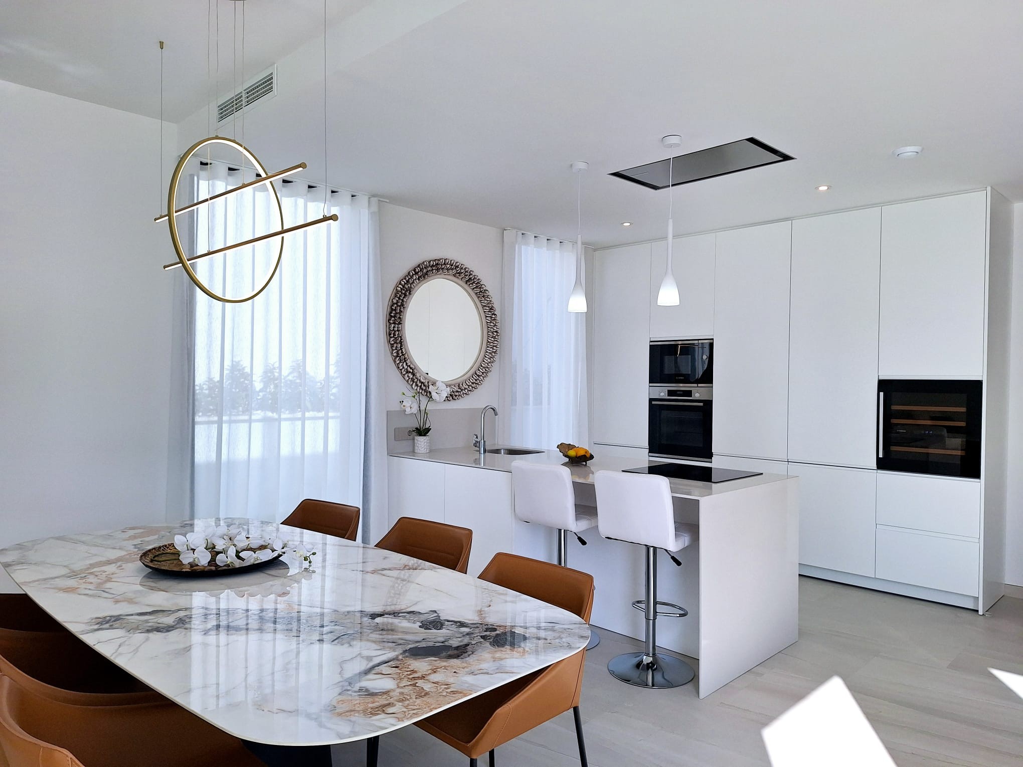 Benidorm felett, Finestraton a Sierra Cortinában 5 csillagos luxusvillák várják új tulajdonosaikat, akik reggelenként a Földközi-tenger ámulatba ejtő panorámájára ébredhetnek. Ez a mediterrán "Beverly Hills" stílusú luxusnegyed pálmafáival, csodás házaival - melyek mögött hatalmas, vadregényes hegyek húzódnak - Finestrat Rózsadombjának is a legelőkelőbb része, melyből elegancia, szépség, és nyugalom árad, amerre csak a szem ellát. A villákban tágas nappali, 3 hálószoba, 3 fürdőszoba, nappali-étkező és felszerelt konyha található. Igény esetén lakberendező alakítja ki az új tulajdonos által megálmodott otthon minden részletét. A konyhákat bútorozottan, gépesítve: - indukciós főzőlap és mikrohullámú sütő - páraelszívó - mosogatógép - sütő - hűtő A kertben: - hatalmas, fűthető medence - fatüzelésű grillező - nagyra nőtt pálmafák, mediterrán gyümölcsfák, virágok Egyedi elképzelés alapján ültetnek, az új tulajdonos igényei szerint, hogy ne kelljen éveket várni a pompás kert látványára. A villák "okosotthonok", technikailag a legkorszerűbb lakásautomatizálás minden részletével felszereltek. Minden a legmagasabb szabványok szerint készült, olyan márkák csúcsminőségű berendezései és anyagai felhasználásával, mint a Florim, Villeroy & Boch, Hansgrohe, Bosch, és még sorolhatnánk.550.000 € - 1,100.000 €