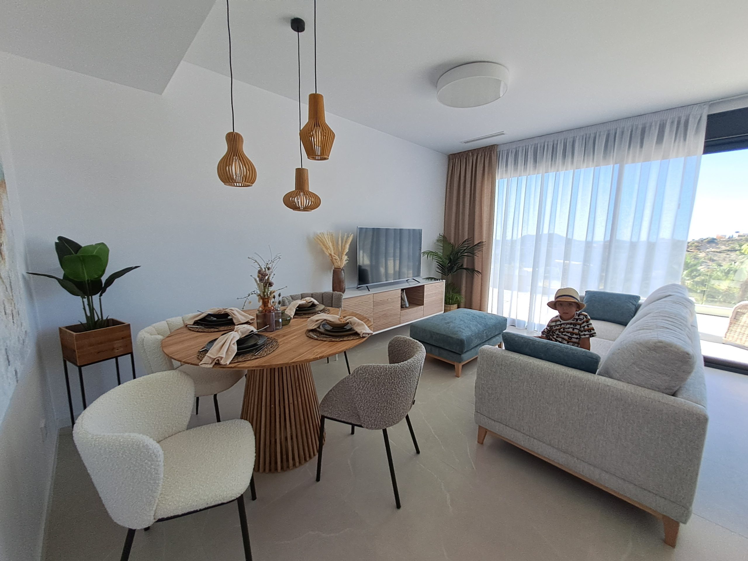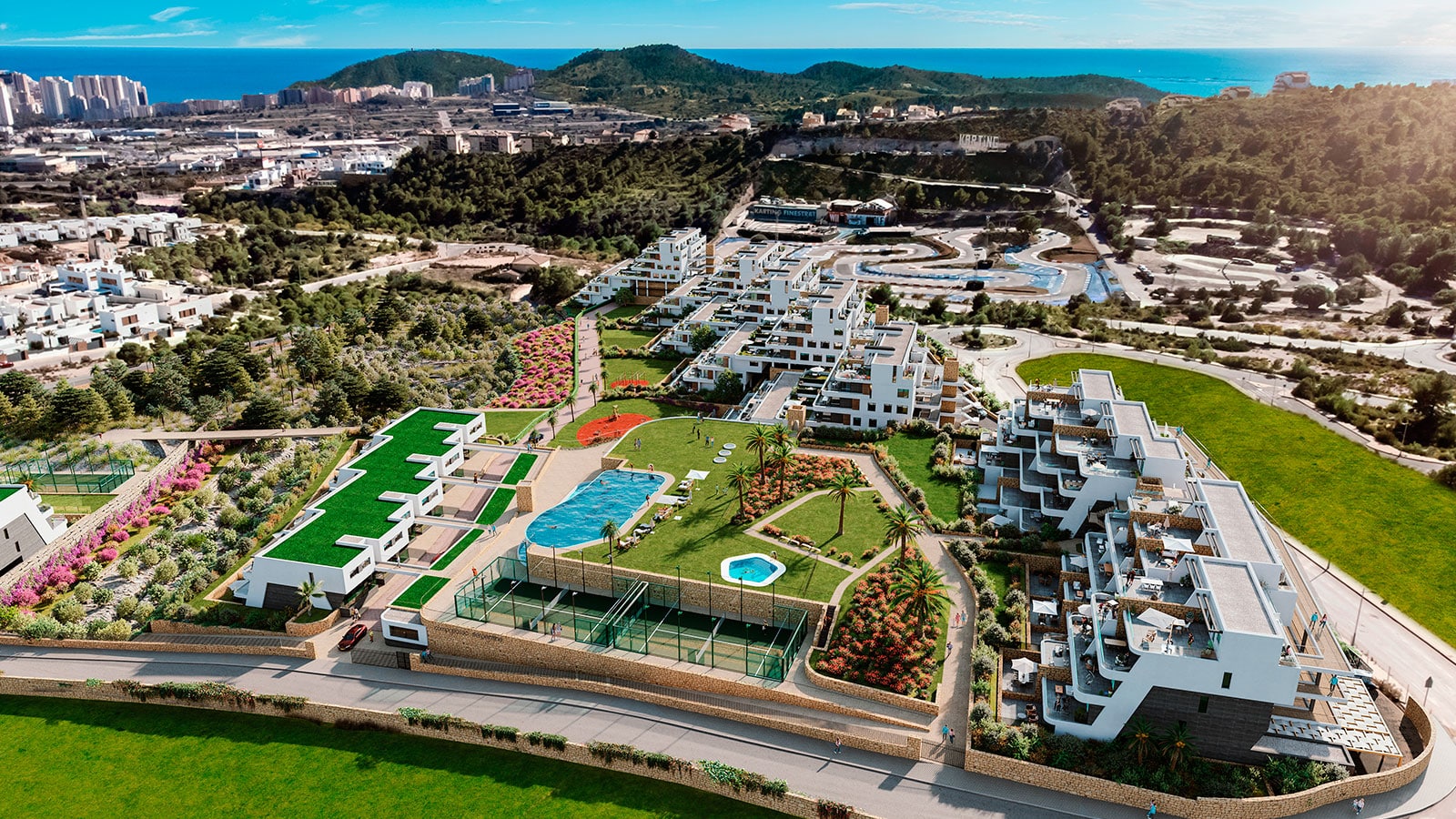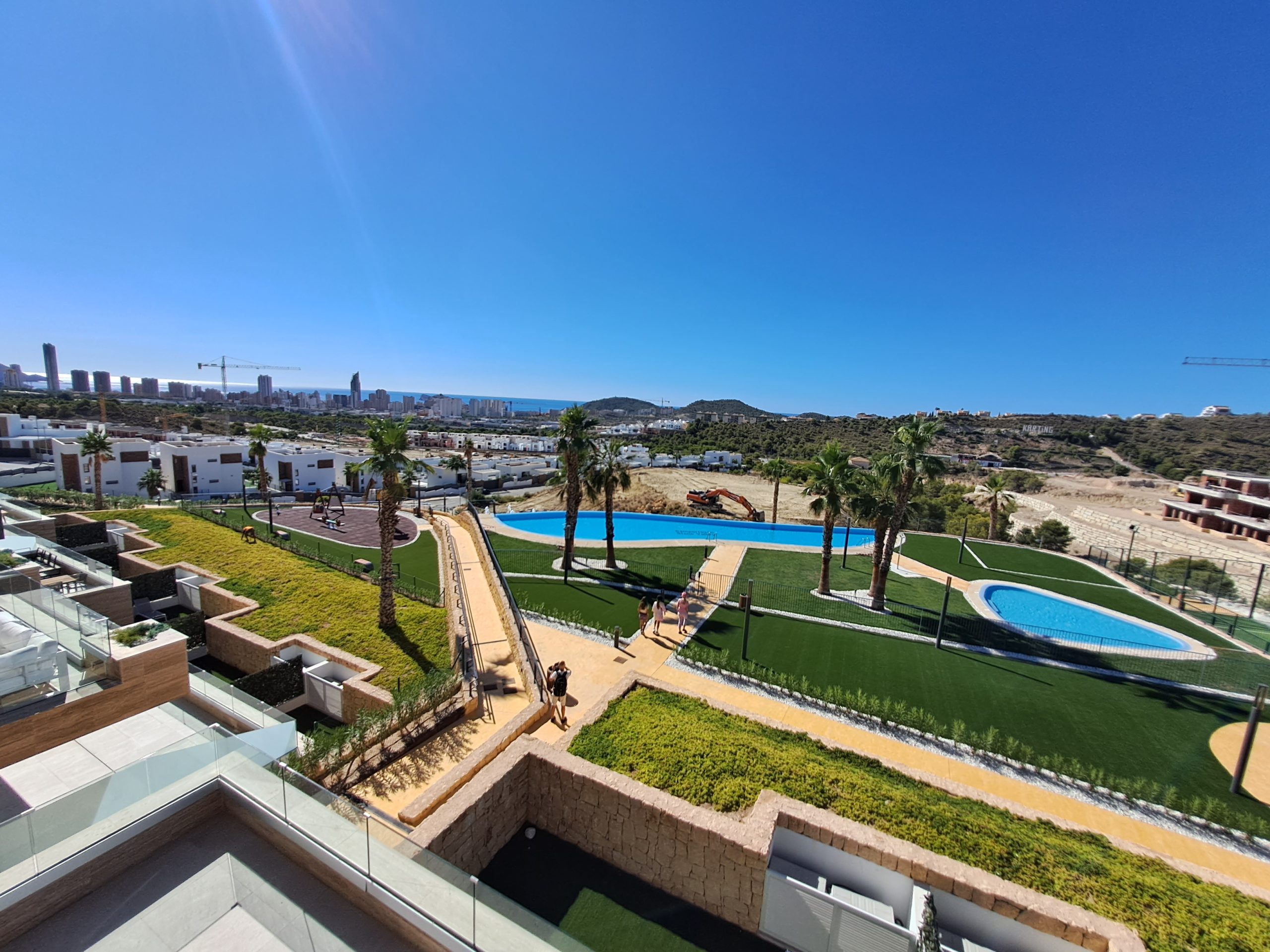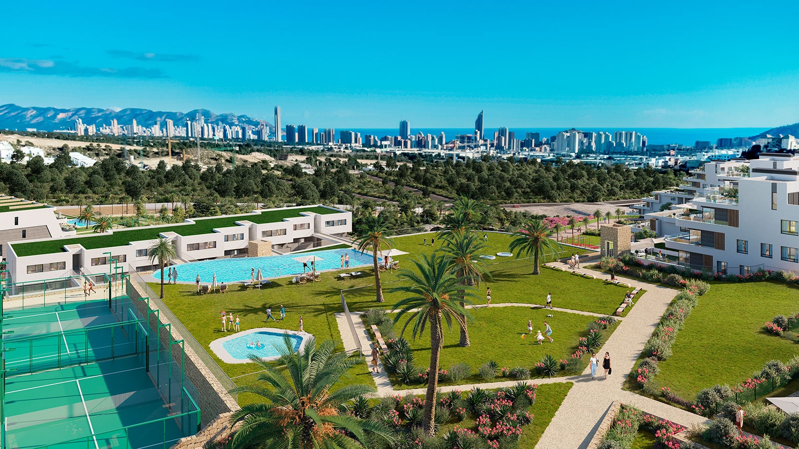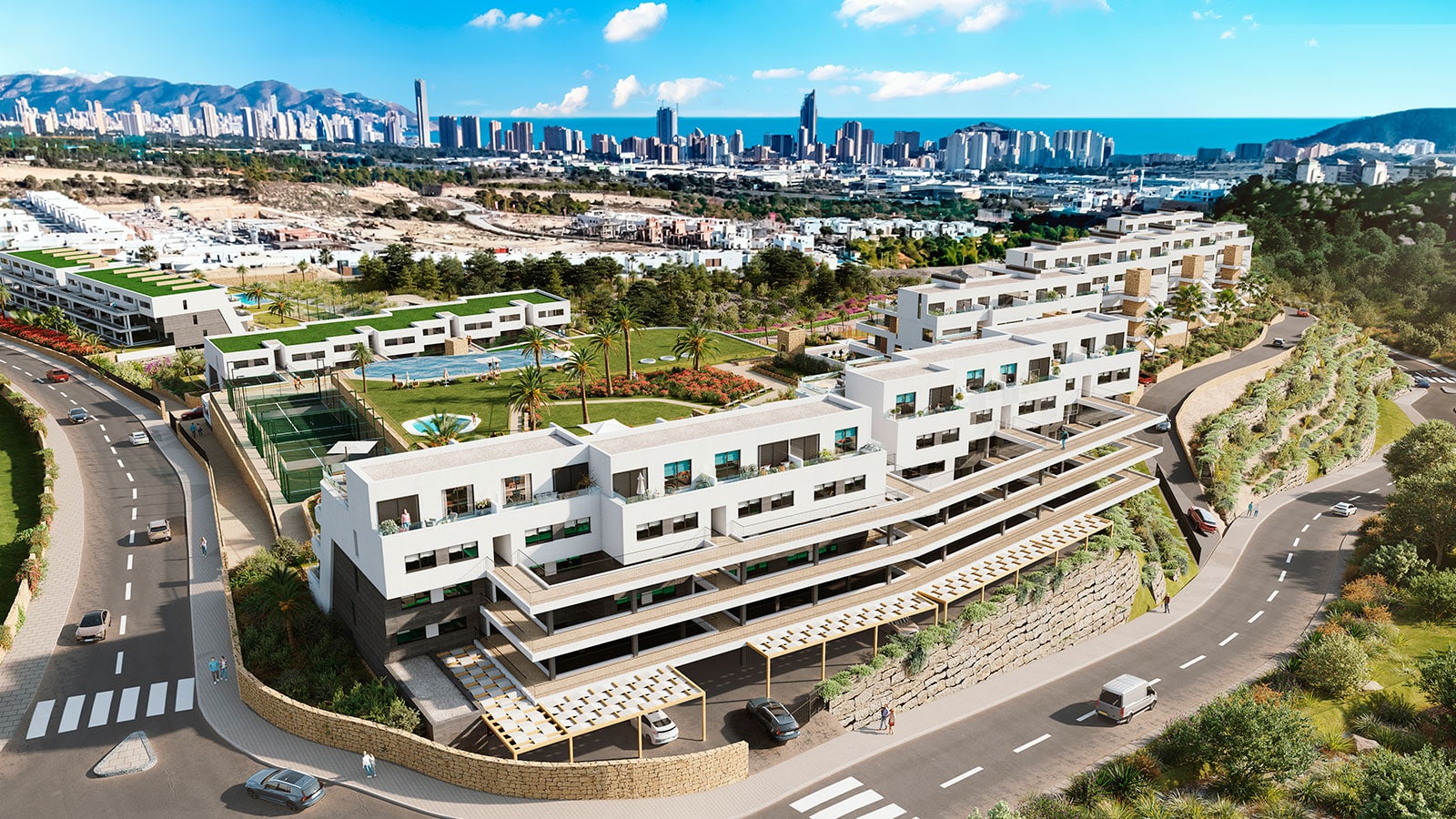 Benidorm kertvárosában, új építésű lakóparkban amerikai-konyhás nappali + 2 hálószobás, nagy erkélyes lakás!