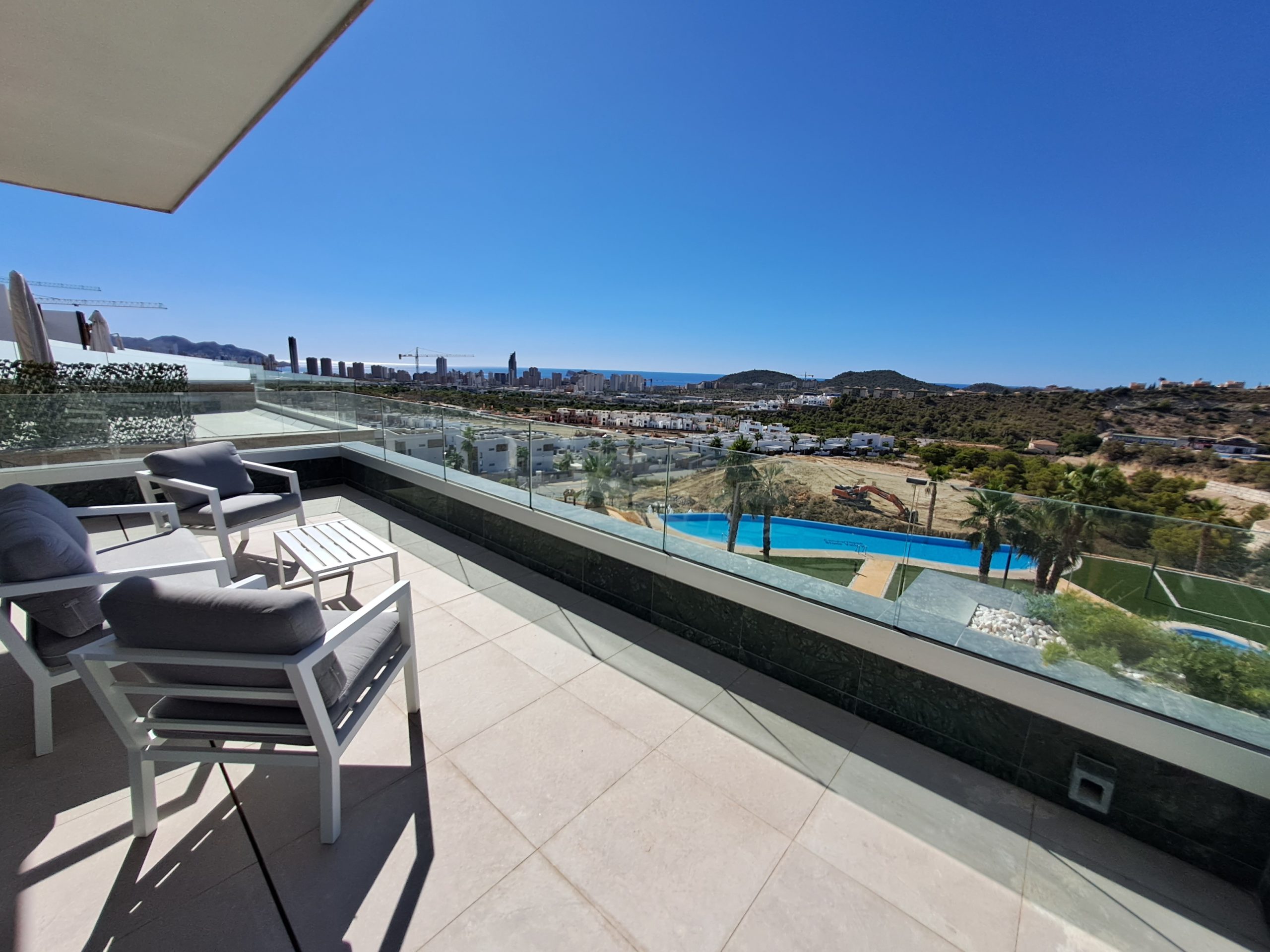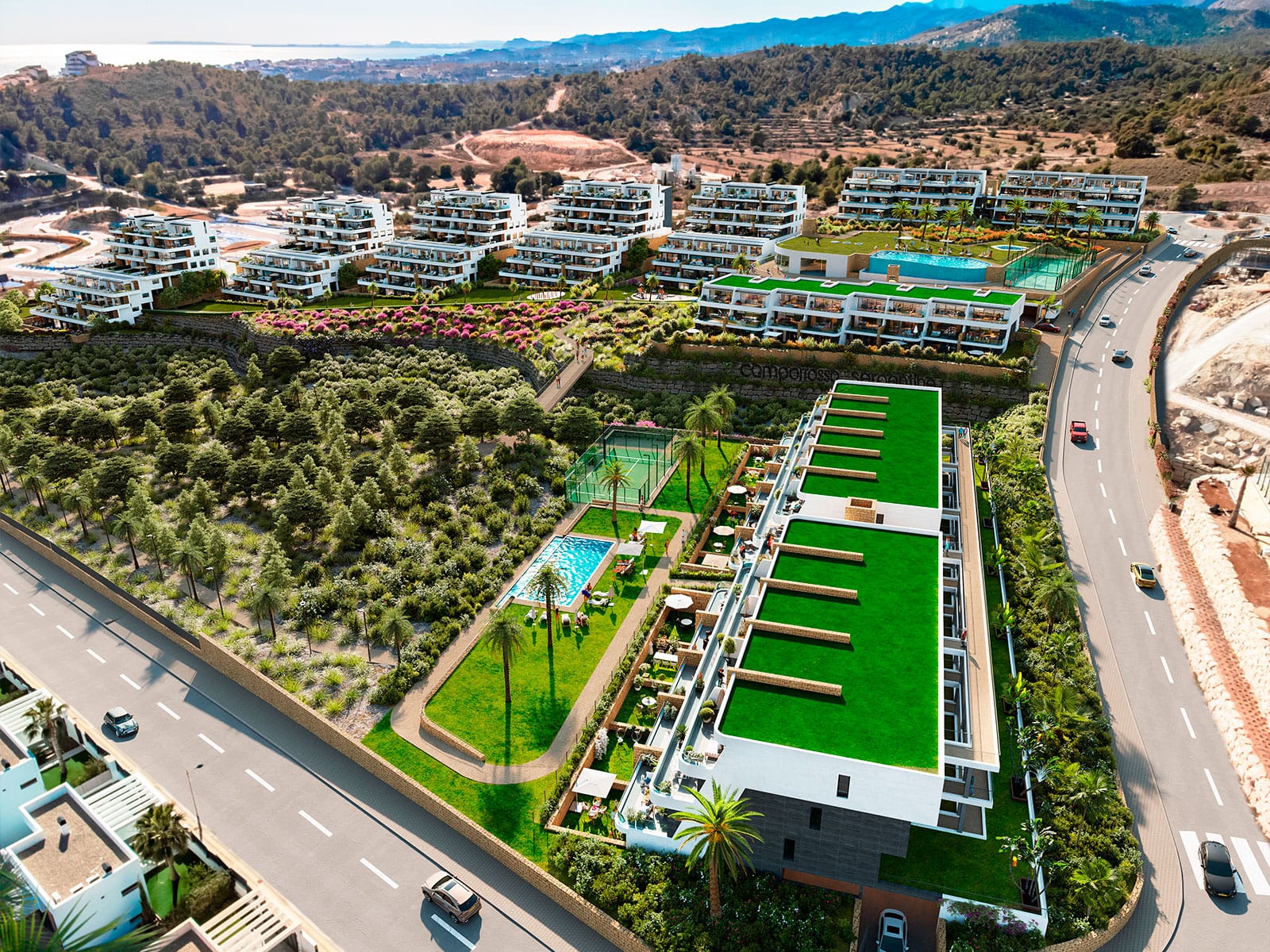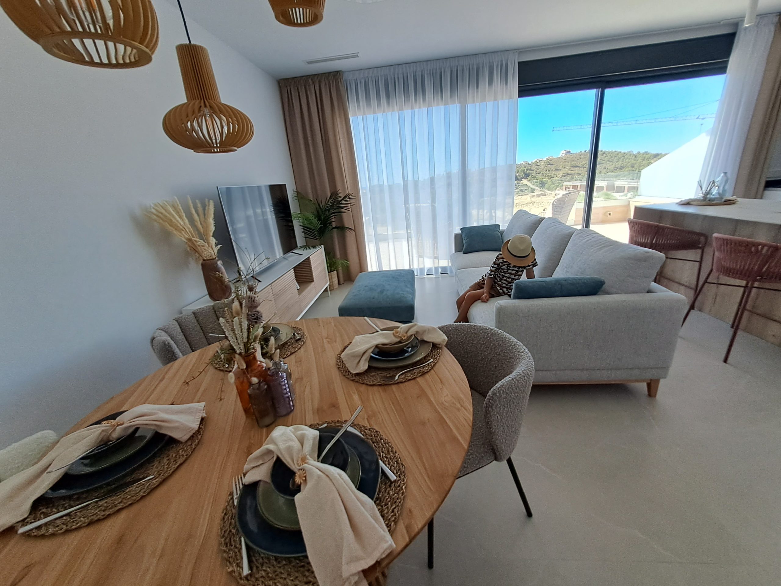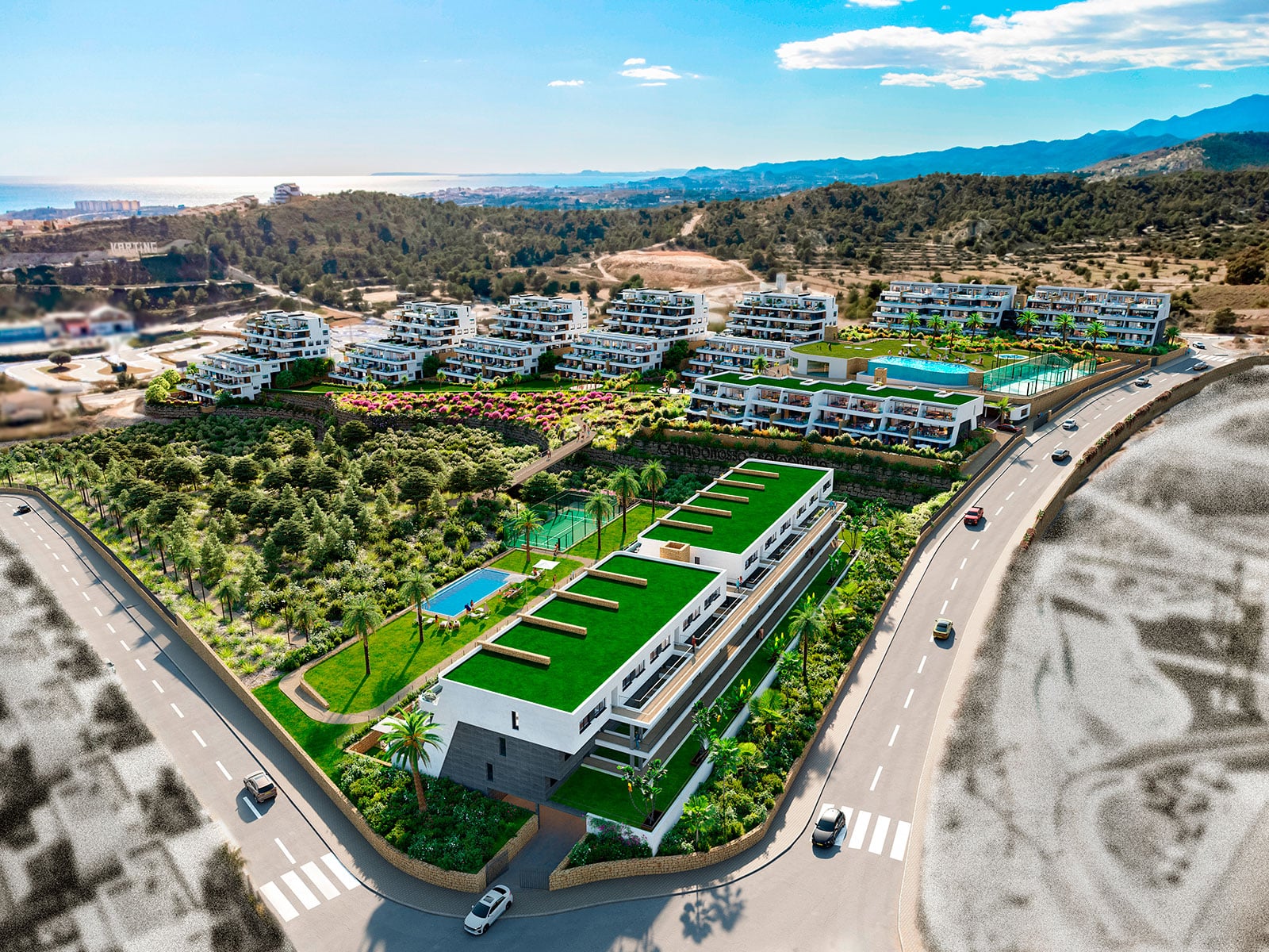Benidorm kertvárosában, új építésű lakóparkban amerikai-konyhás nappali + 2 hálószobás, nagy erkélyes lakás!