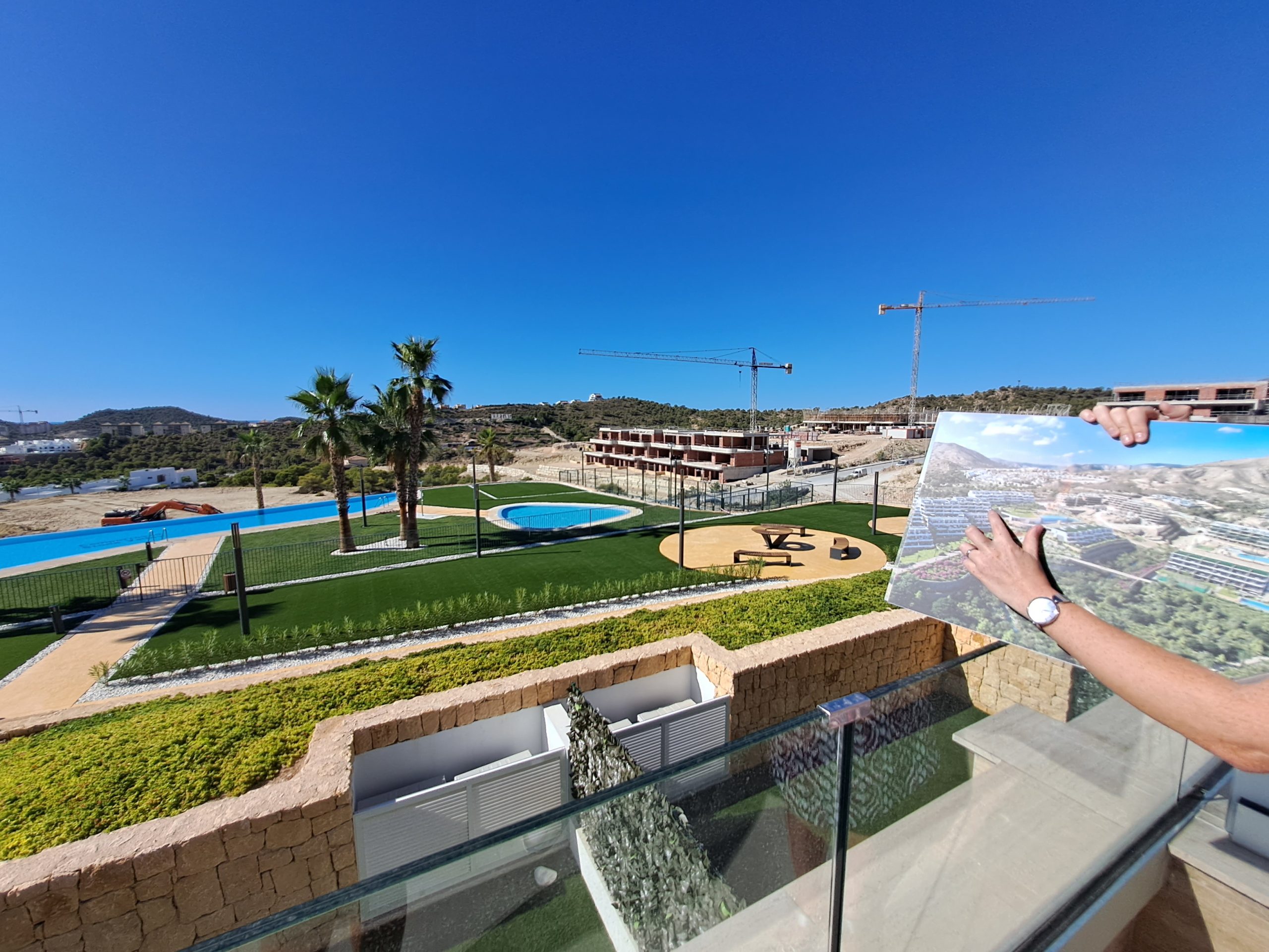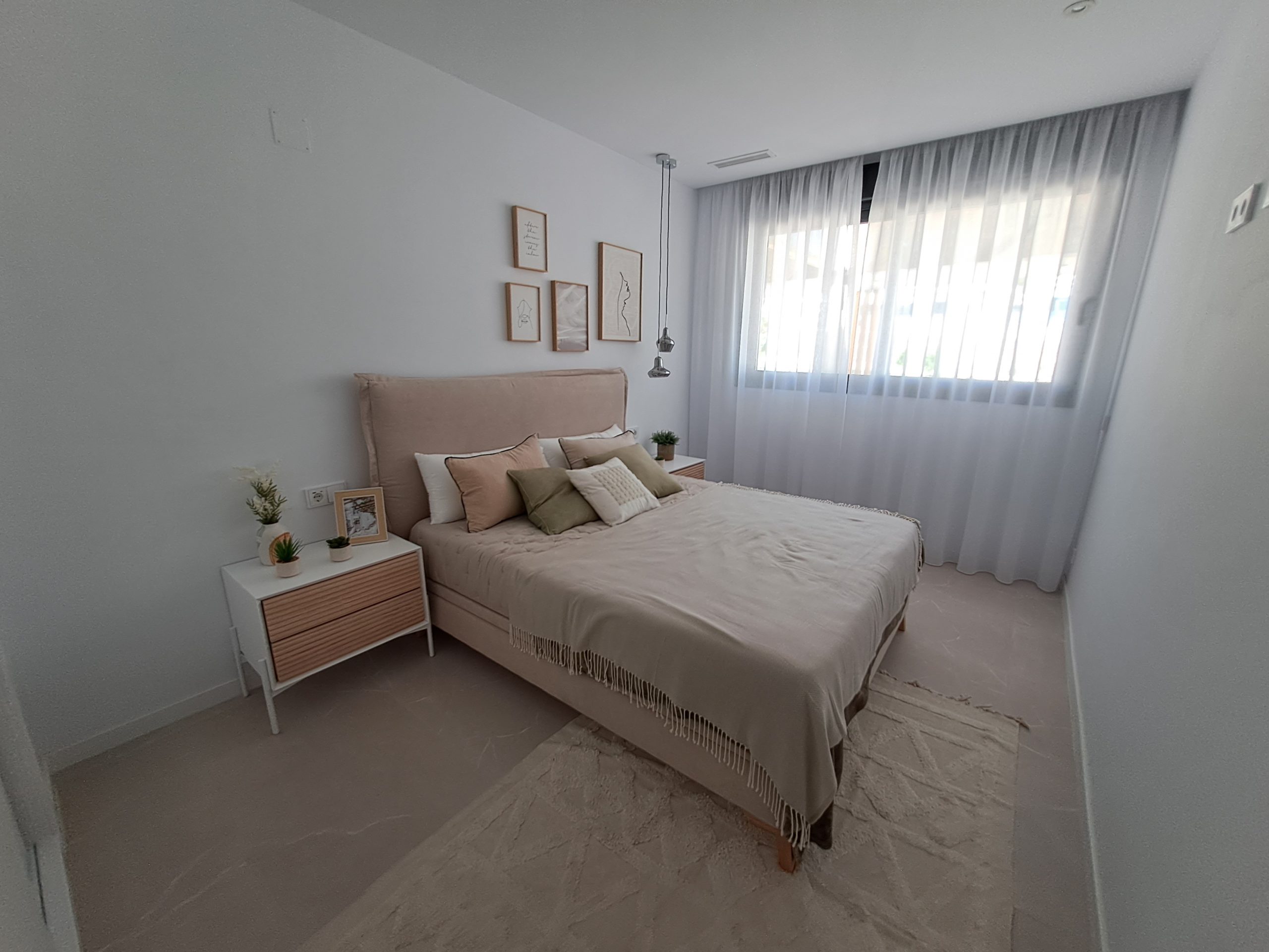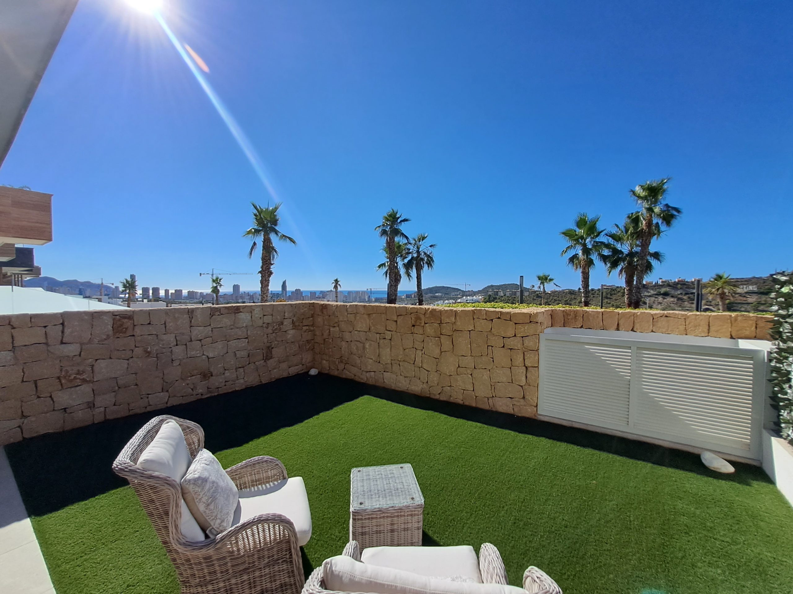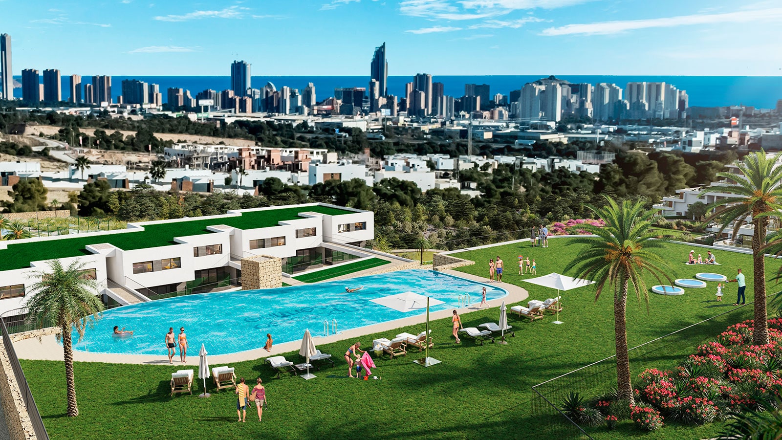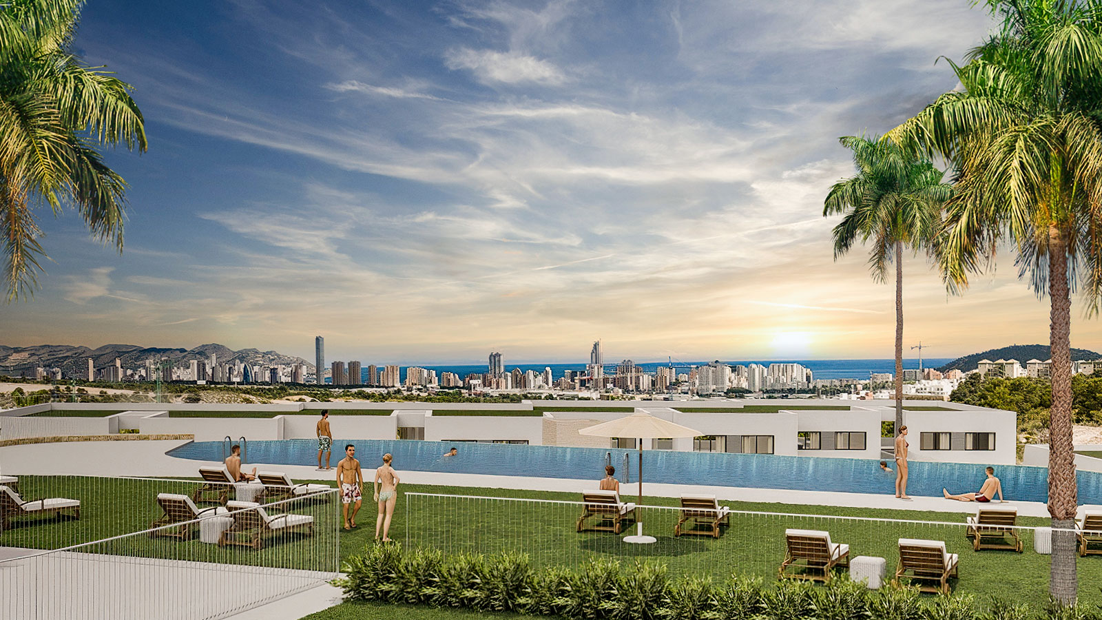 Benidorm kertvárosában, új építésű lakóparkban amerikai-konyhás nappali + 2 hálószobás, nagy erkélyes lakás!