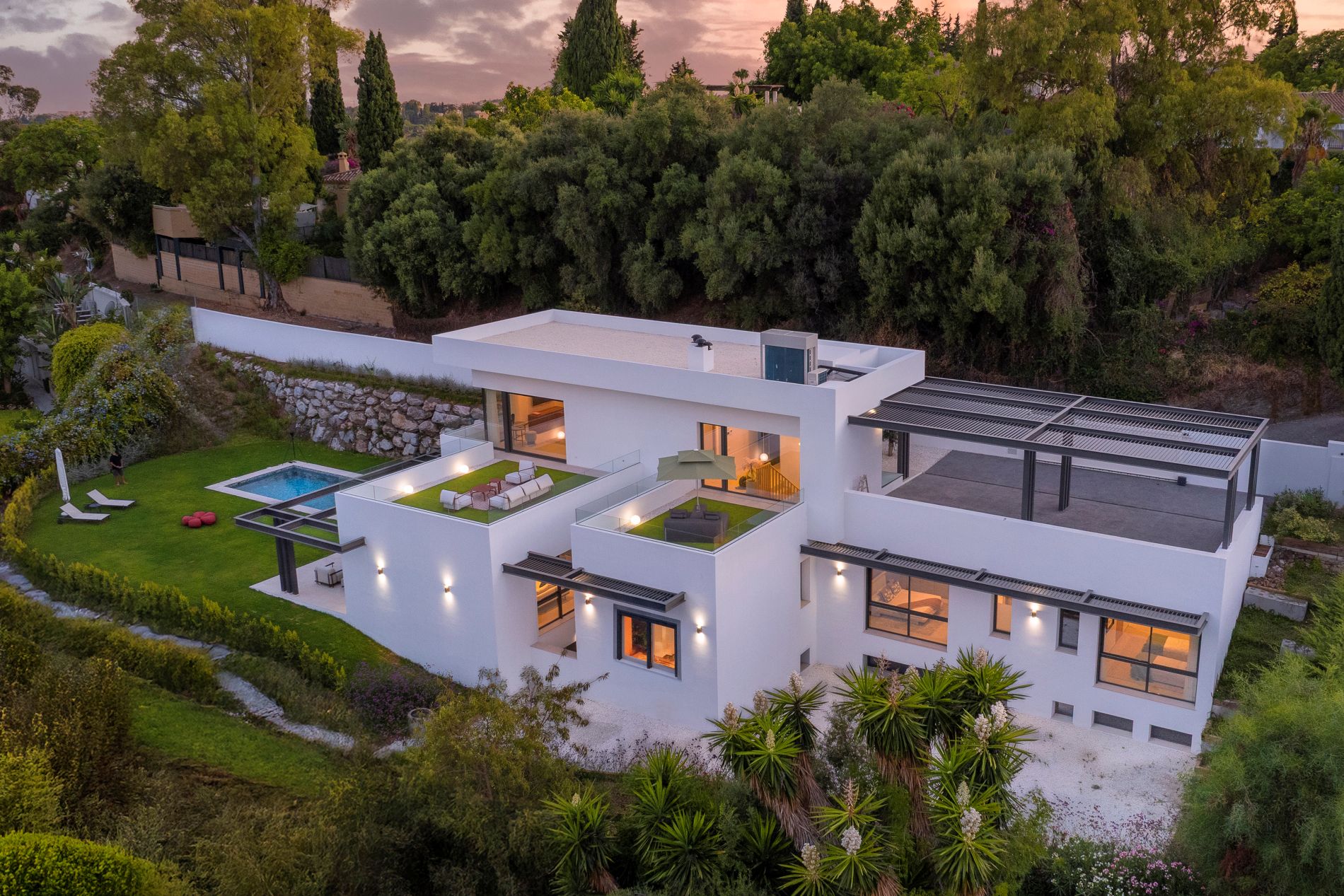 A Camino del Higueral utcában található, déli fekvésű, újonnan épült családi házat kínálunk eladásra. Ez az egyedülálló ingatlan a kortárs dizájnt ötvözi az ideális elhelyezkedéssel. A természet által körülvett ingatlan mindössze öt percre fekszik San Pedro de Alcántarától, valamint tíz percre Marbellától és Puerto Banústól, így tágas, stílusos otthont kínál egy nyugodt, kiváló közlekedési kapcsolatokkal rendelkező környezetben. A legkiválóbb minőségű anyagokból és kiváló kivitelezéssel épült villa kulcsrakész állapotban kerül értékesítésre. A teljes belsőépítészetet és berendezést a Bonaldo végezte, egy több mint nyolc évtizedes múlttal rendelkező, neves olasz márka, amely arról ismert, hogy minden darabjában ötvözi az esztétikát, az innovációt és a funkcionalitást. Az eredmény egy elegáns, barátságos és teljesen funkcionális otthon. Az ingatlan három szinten helyezkedik el, és egy világos nappalival rendelkezik, amelyhez nyitott konyha tartozik, valamint közvetlen kijárat nyílik a teraszra, a kertre és a saját medencére. Hat hálószobával rendelkezik, mindegyik saját fürdőszobával, valamint két vendég WC-vel. A fő hálószoba az első emeleten található, és egy nagy gardróbszobával rendelkezik. Van még egy tágas, nyitott terű alagsor is, amely sokoldalú, üres vászonként ideális edzőterem, moziszoba vagy szórakoztató terület kialakításához, a leendő tulajdonos igényeinek megfelelően. A villa a legmodernebb otthoni technológiával van felszerelve, beleértve egy teljes domotikus rendszert és aerotermikus klímaberendezést, amely egész évben biztosítja az energiahatékonyságot és a kényelmet. Ezen felül egy fedett, két jármű befogadására alkalmas gépkocsi-beállóval is rendelkezik. Ez az ingatlan kiváló lehetőséget kínál azok számára, akik egy modern és tágas otthont keresnek, ahol minden részletet gondosan átgondoltak, hogy a mediterrán életmódot maximális kényelemben élvezhessék.